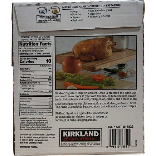 品名 有機チキンストック 容量 5.68L(946ml x 6本) 原材料名 有機チキンストック、有機野菜ブロス、食塩、有機濃縮ターメリック、有機粉末ベイリーブス、有機黒胡椒エキス/香料 原産国 アメリカ 保存方法 直射日光や高温多湿を避け、18℃以下の涼しい場所で保存してください。